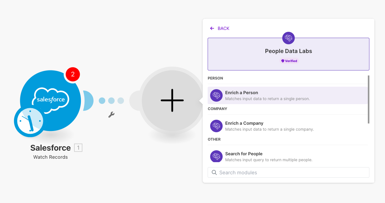 For the second module, select People Data Labs and then the Make an API Call option.