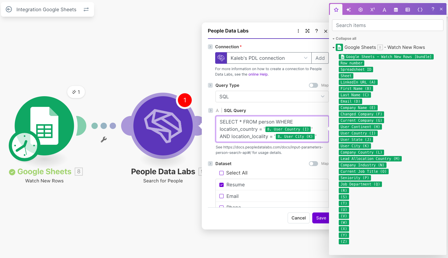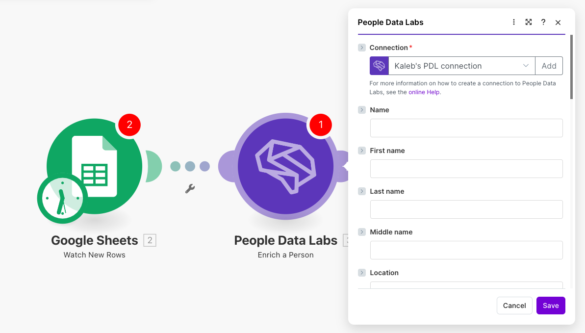For the second module, select People Data Labs and then the Enrich a Person/Company option. Selecting an input will allow you to map it to a field from your sheet/app of choice.